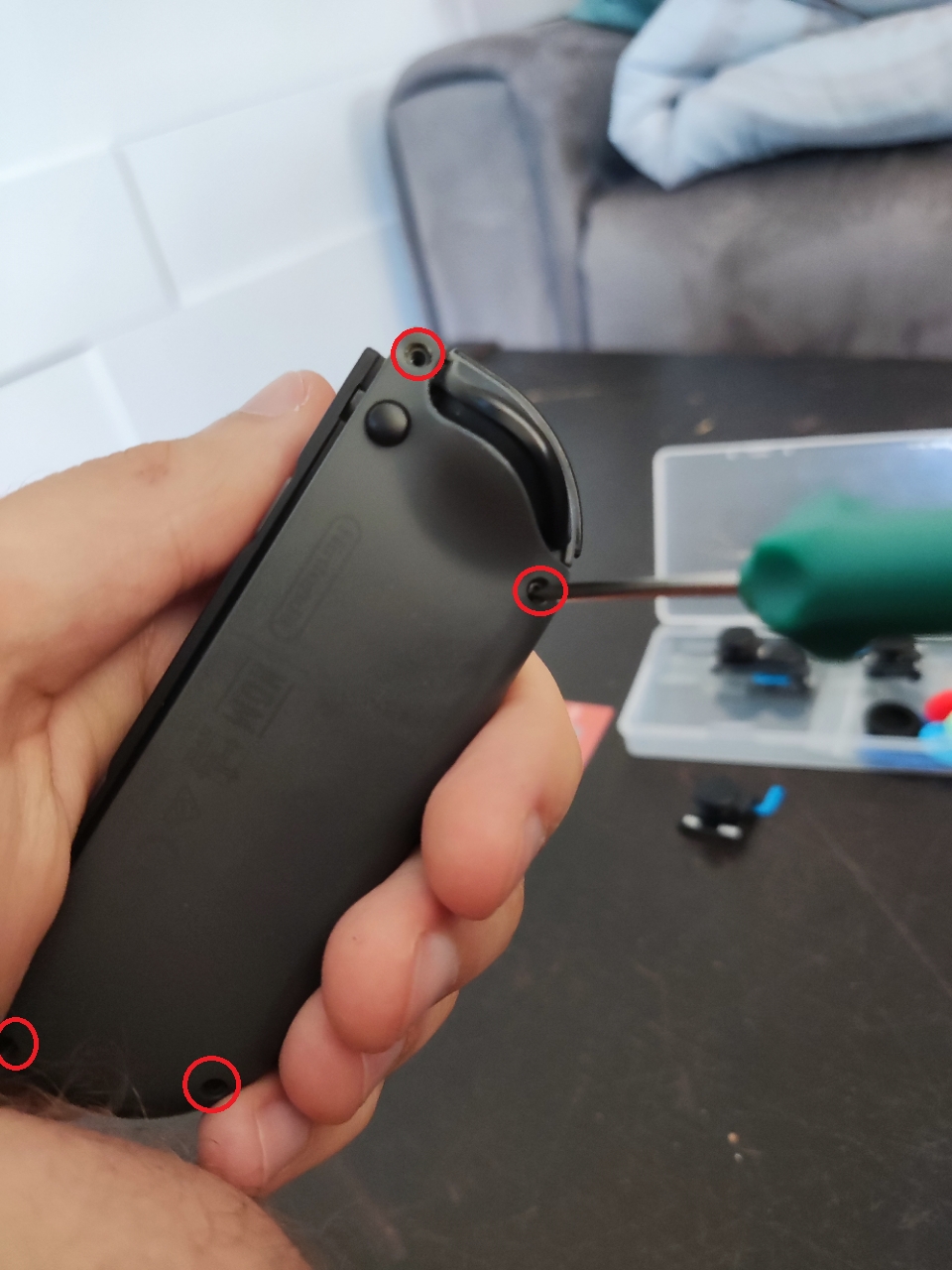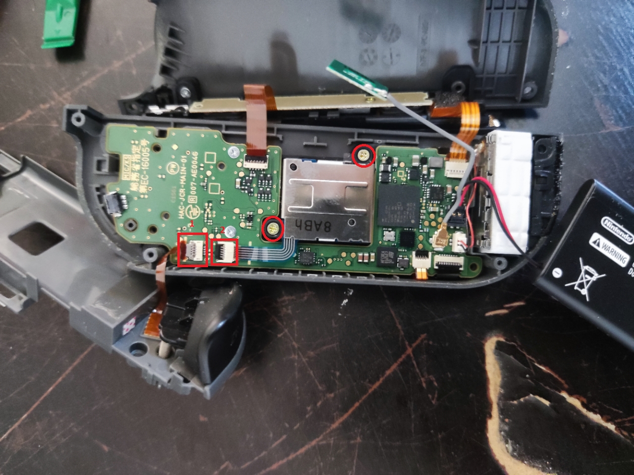 Puis retirer les deux vis entourées ce qui va libérer le joycon et vous pourrez mettre à sa place un des nouveaux joycon.