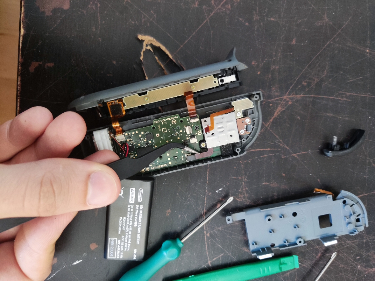 Et voilà ! Il "suffit" de faire toutes les opérations précédentes à l'envers et ainsi remonter le joycon. Attention pour mettre le câble plat je recommande vivement d'utiliser le tweezer afin d'être plus précis :
